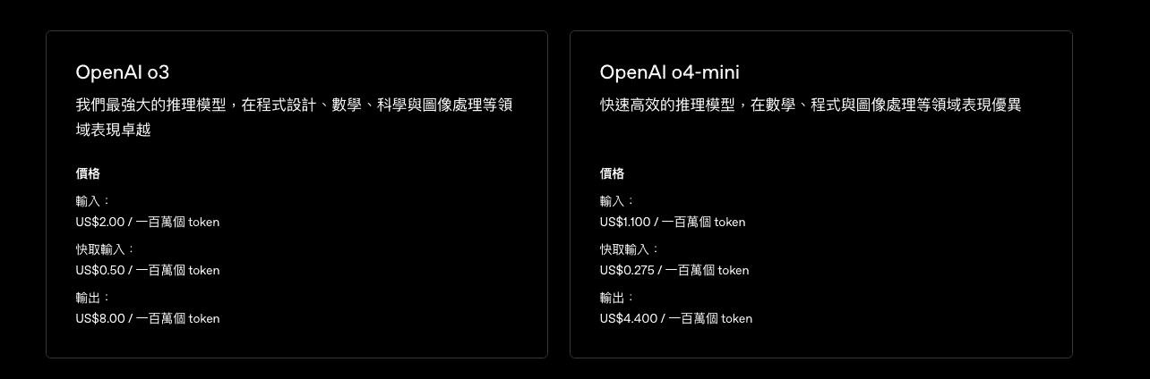 o4-mini | 輸入:US$1.10 輸出:US$4.40 | 輸入:0.00011 USD 輸出:0.00044 USD 合計:0.00055 USD → 大約 0.018 新台幣 |