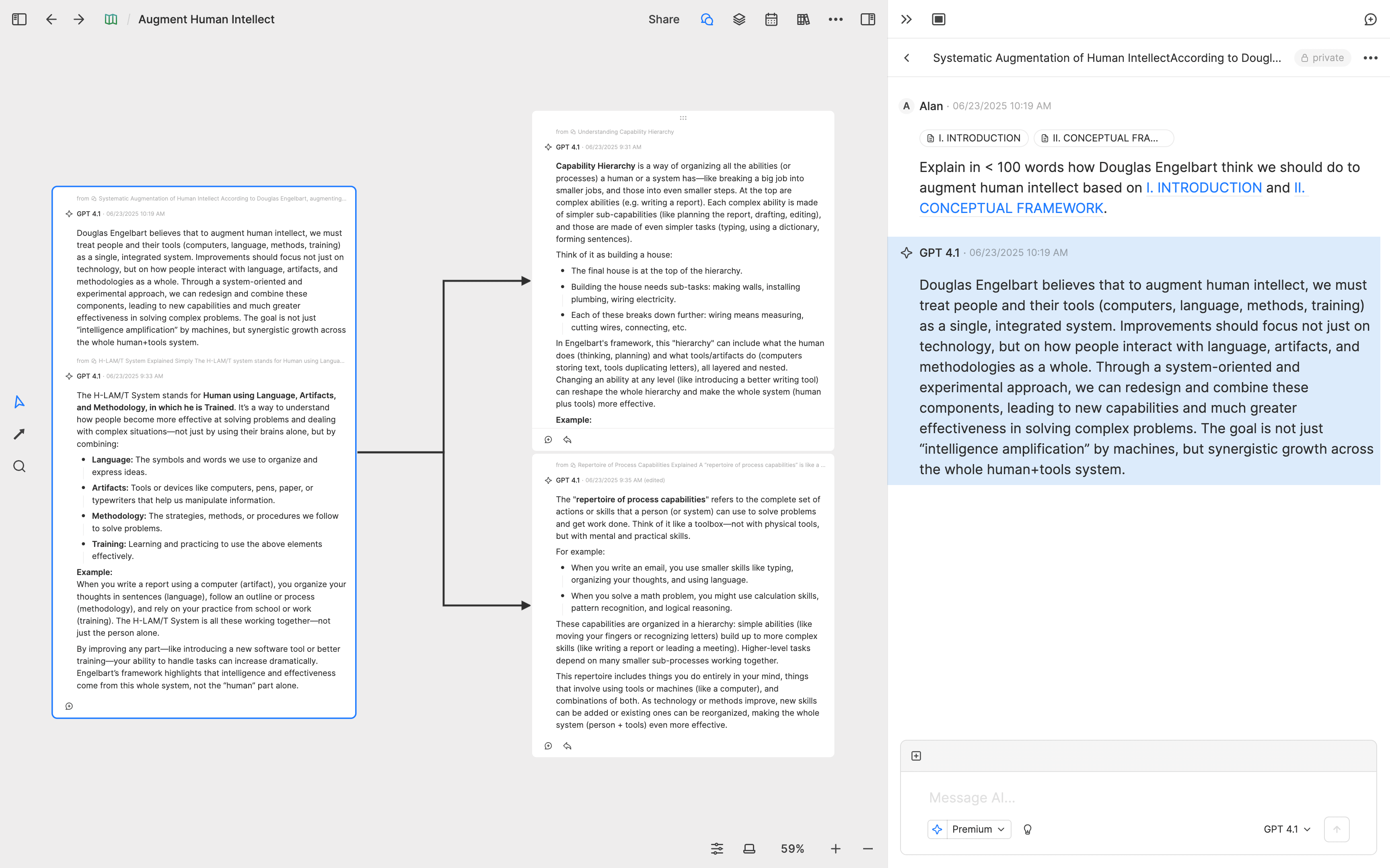 透過這種空間化的操作,你能進一步展開更深入的探討與關聯延伸,建構出具備脈絡的知識圖譜。隨著工作與學習的推進,這些對話紀錄以及思考過程將在白板上轉化為個人的「知識資產」,並可無限延伸、繼續拆解與重組,建立真正屬於自己的深度理解 。